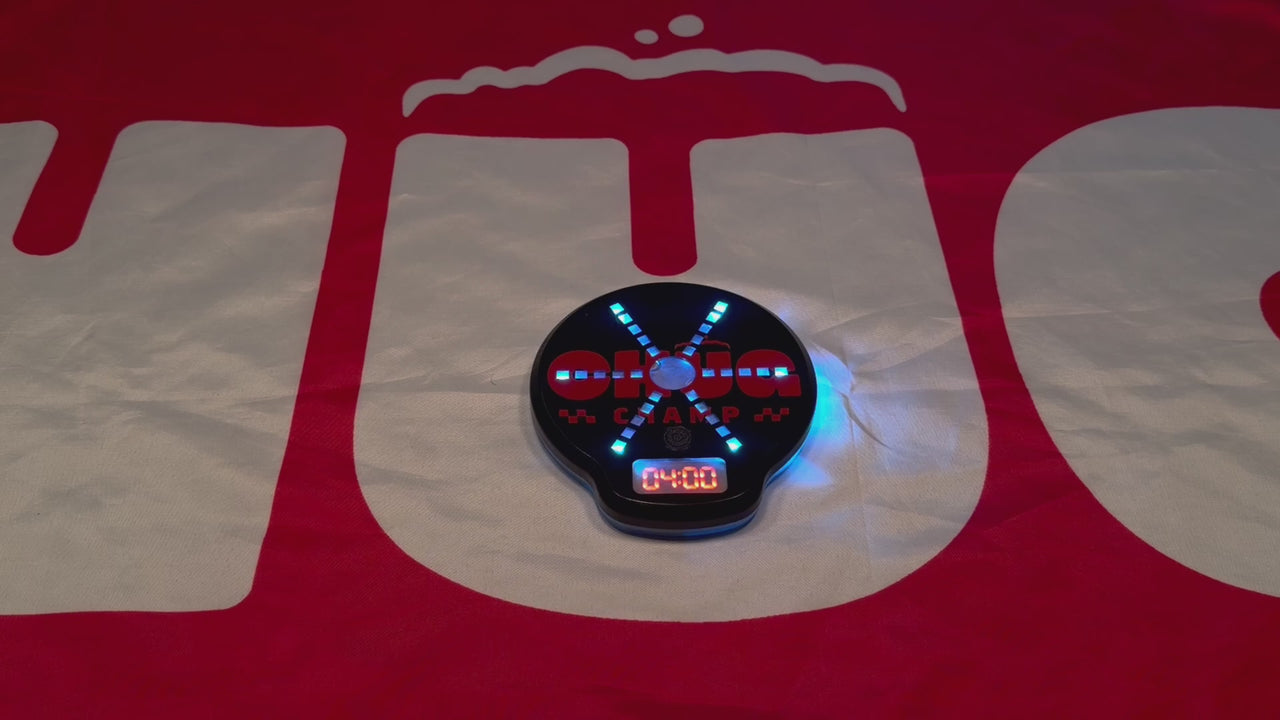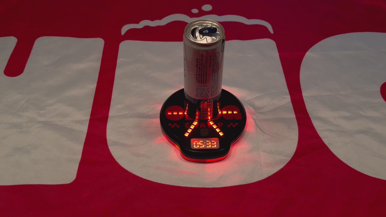 The Chug Coaster is an infrared sensor-driven, LED-illuminated drink coaster that precisely times your chug down to the hundredth of a second. It uses an infrared proximity sensor (over 880 scans/sec) to detect when your drink is lifted and set down — no stopwatch, no arguments.